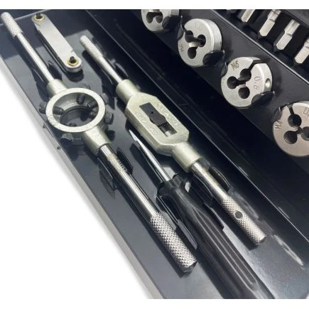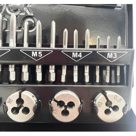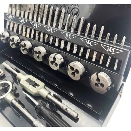 - M3 to M12 steel tap and die set manufactured from alloy steel providing improved cutting performance.