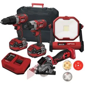 The Lumberjack 4 piece XP SERIES power tool kit includes an Impact Driver, Combi Drill, Mini Plunge Saw, Work Light, 1 x Fast Chargers, 2 x 4.0Ah Batteries & 1 x Case for ease of transportation.
