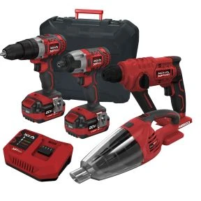 The Lumberjack 4 piece XP SERIES power tool kit includes an Impact Driver, Combi Drill, SDS Drill, Vacuum, 1 x Fast Chargers, 2 x 4.0Ah Batteries & 1 x Case for ease of transportation.
